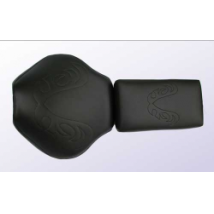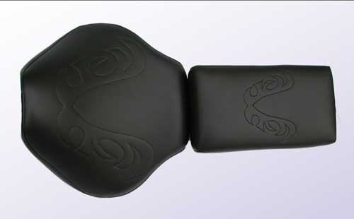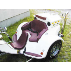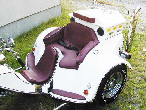 Bei diesem Trike wurden gemäß Kundenwunsch die Sitzpolster ersetzt. Der Soziussitz bekam seitliche Taschen in die Armlehnen und Ziernähte in die Sitzfläche, wobei die Rückenlehne ohne Ziernaht auskommen musste. Die Formgebung war nicht ohne Seitenböden möglich. Auch der Fahrersitz bekam wieder diverse Quernähte zur Zierde.